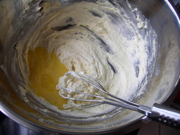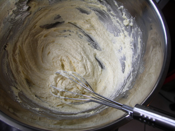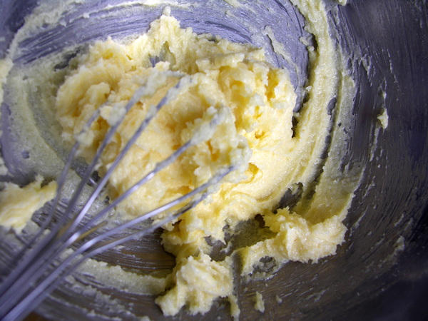 1 將奶油、砂糖一起放入鋼盆中打發至呈乳白色狀,再分2次加入全蛋拌勻,