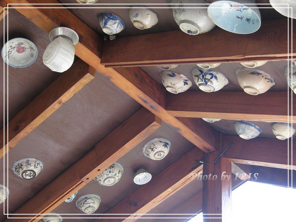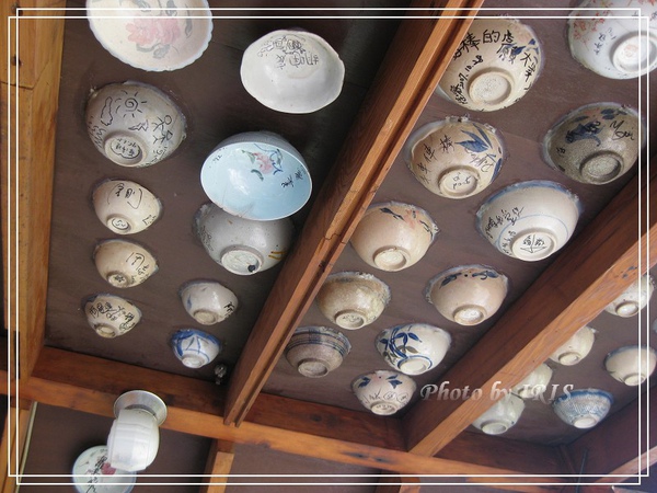 老闆會把客人簽名的碗一一的黏貼在涼亭跟入口處的天花板上