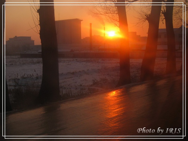 東北的夕陽染紅了天空,光線照在金屬做的收費站名上不用開燈都覺得亮晶晶