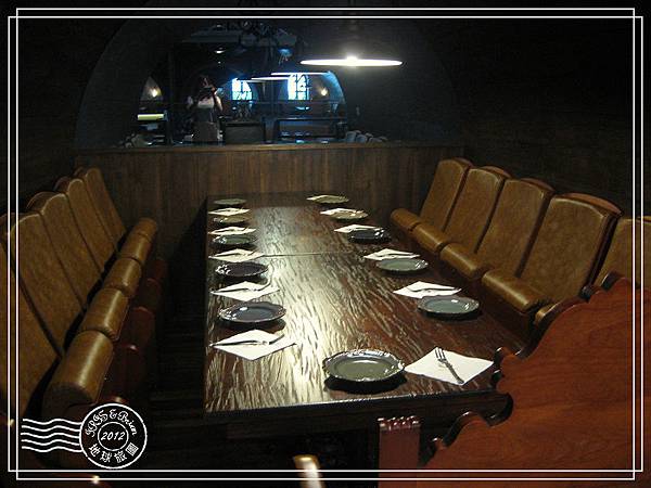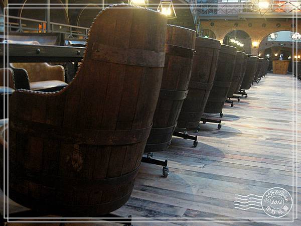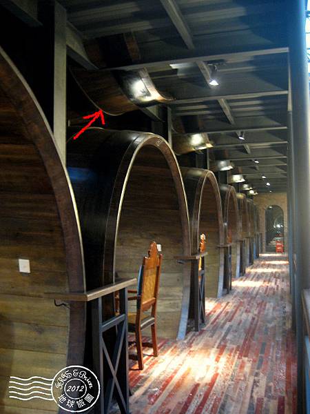 超大的木桶成了11人座的獨立空間 (紅色箭頭指的是二樓木桶的底部)