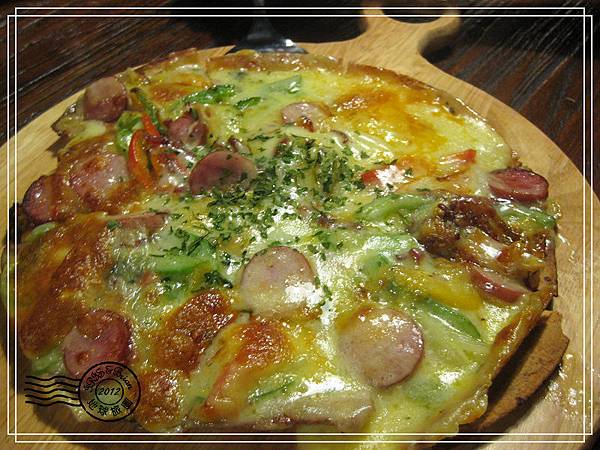 德國香腸披薩 霜層的薄餅皮口感內層軟外層酥脆